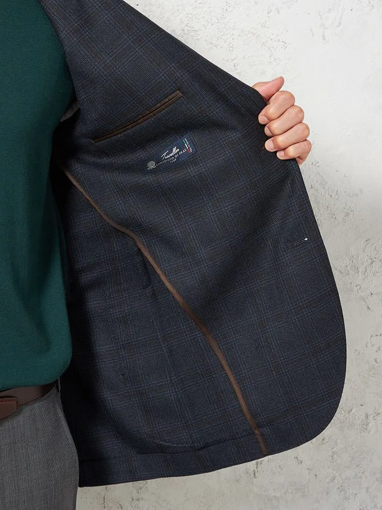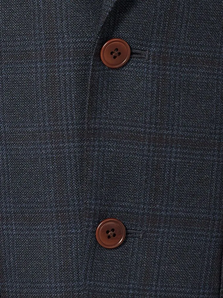 トラッドなチェック柄2つボタンデザインに高品質で艶のある複雑な色合いが魅力。