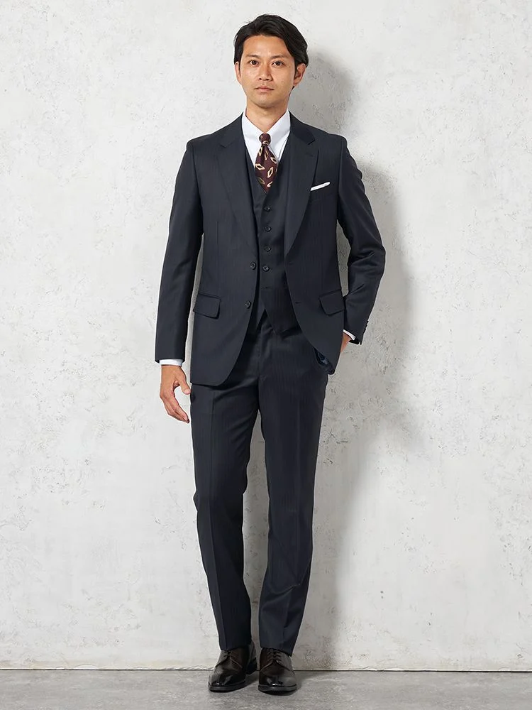 光沢感あるトレンドカラーを採用したスリーピーススーツです。