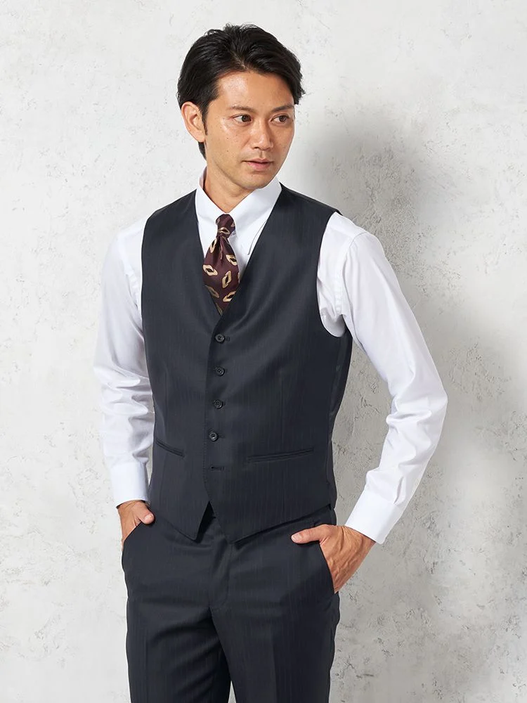 ジャケット、パンツ、ベストの3点セットで、スーツ全体を簡単にコーディネートできます。ビジネスやフォーマルな場面に最適です。