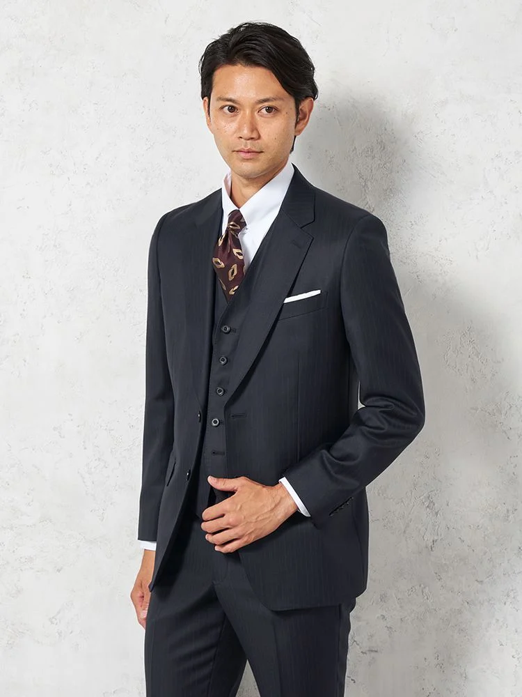 【ウール混】スリーピーススーツ 2つボタン キュプラ裏地 シャドウストライプ S&M BLUE LABEL