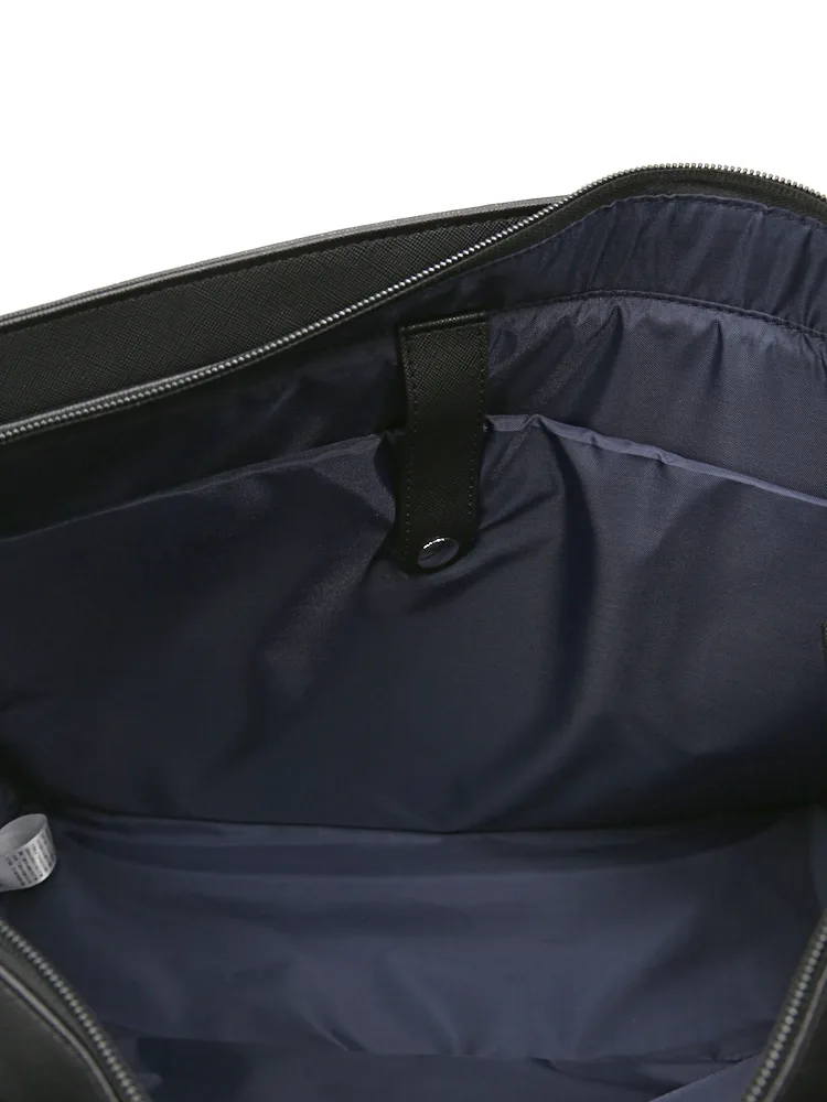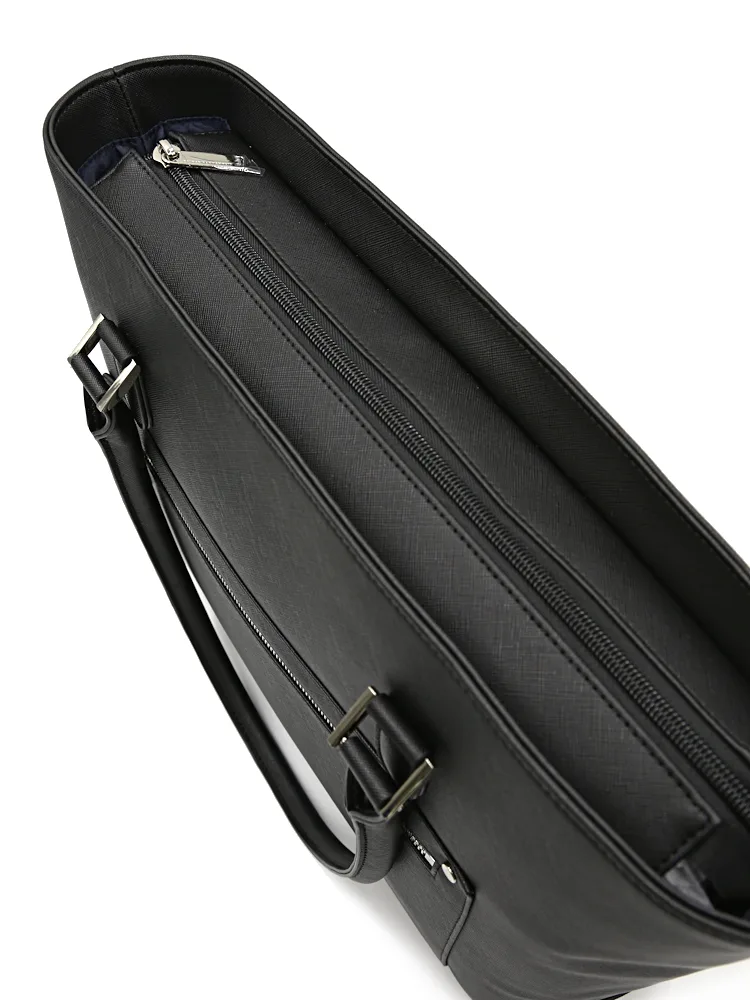 サフィアーノ調の型押し合成皮革に、前面のメタルファスナーポケットがアクセントになり、シャープでスマートな印象です。
