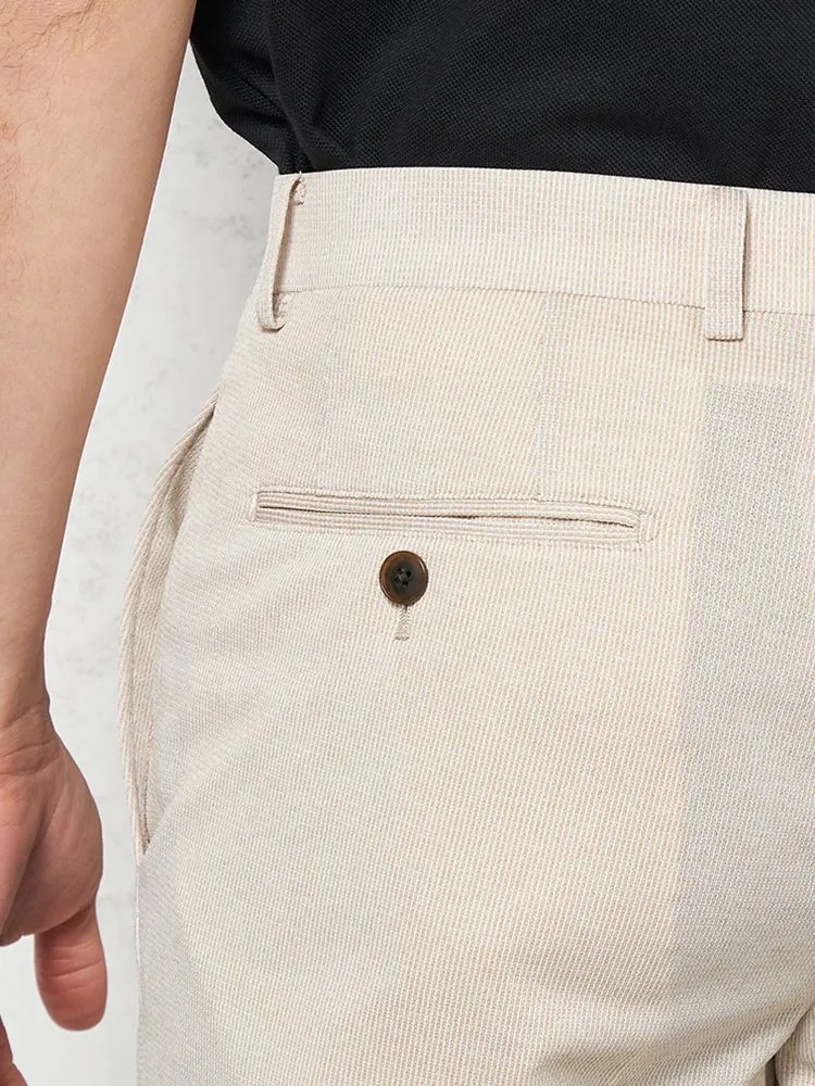 パンツの腰回りに生地の折り込みがなく、スッキリとしたシルエットを実現します。シンプルで洗練された印象を与え、すっきりとした着こなしが可能です。