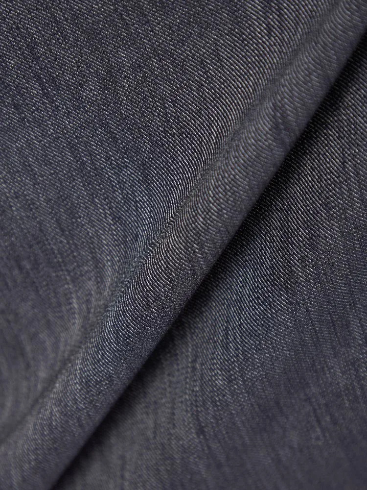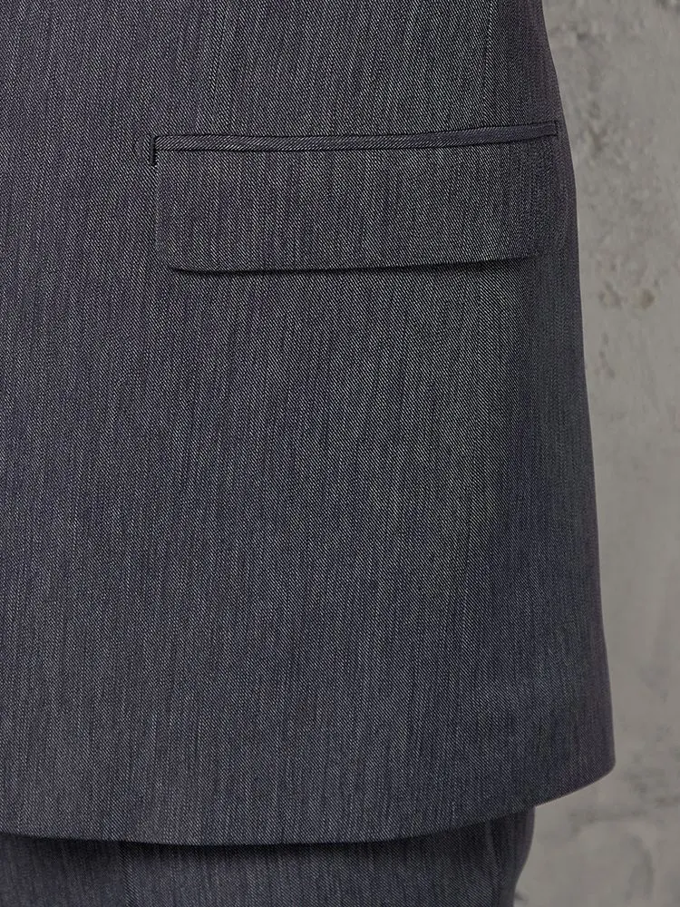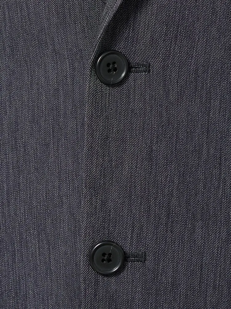 デニム生地で仕立てた、モダンな表情の2つボタンセットアップスーツ。
