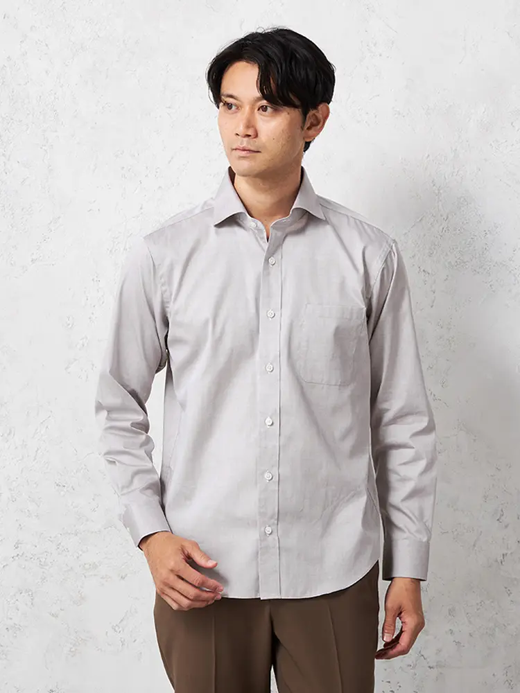 襟が大きく開いたデザインで、さりげないおしゃれ感を演出してくれる長袖カッタウェイシャツです。