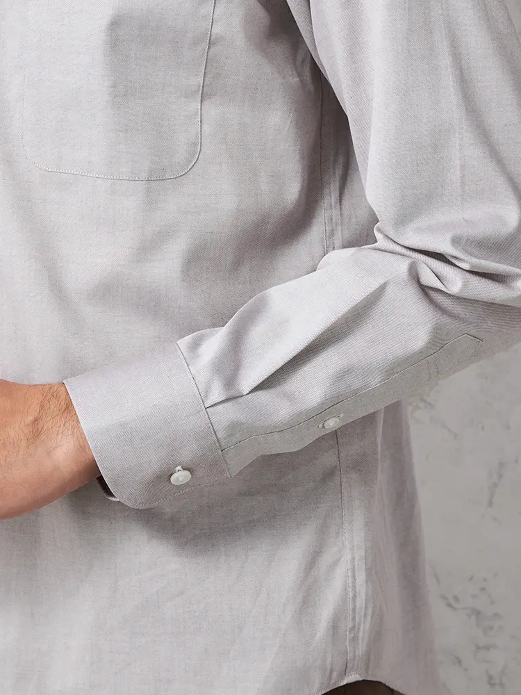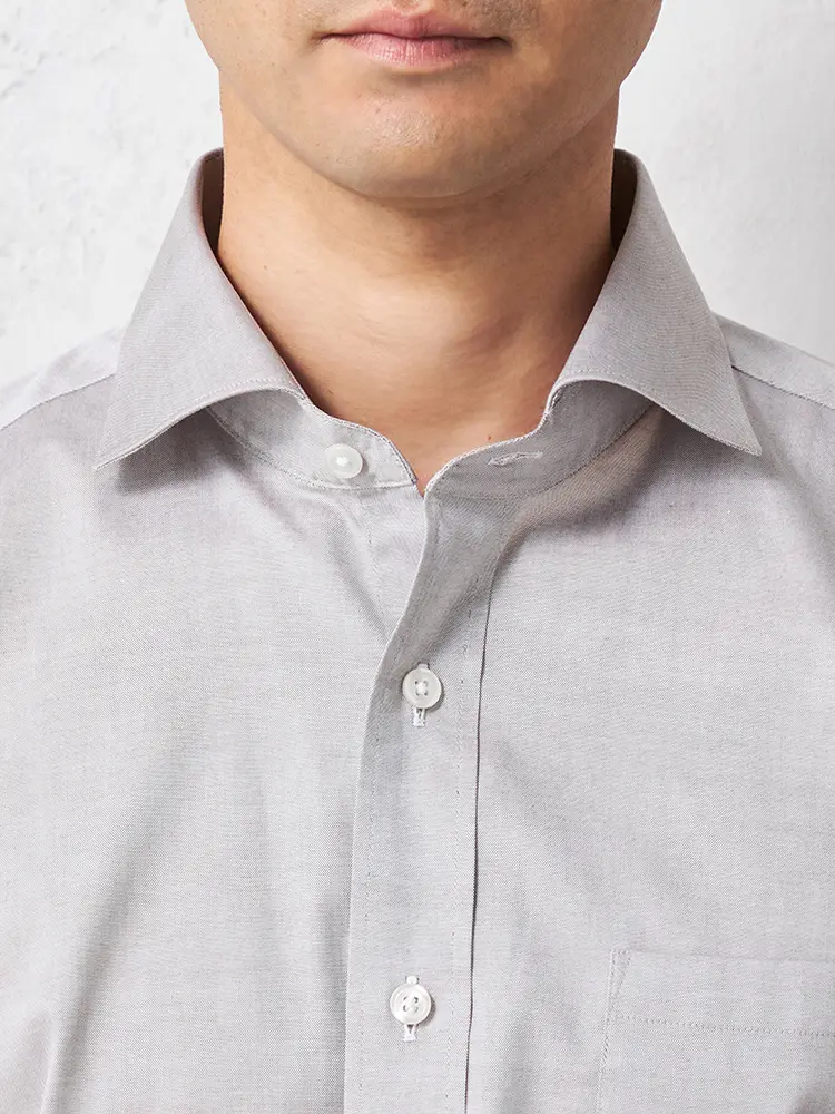 さりげないおしゃれ感を演出する、襟が大きく開いた長袖カッタウェイシャツです。
