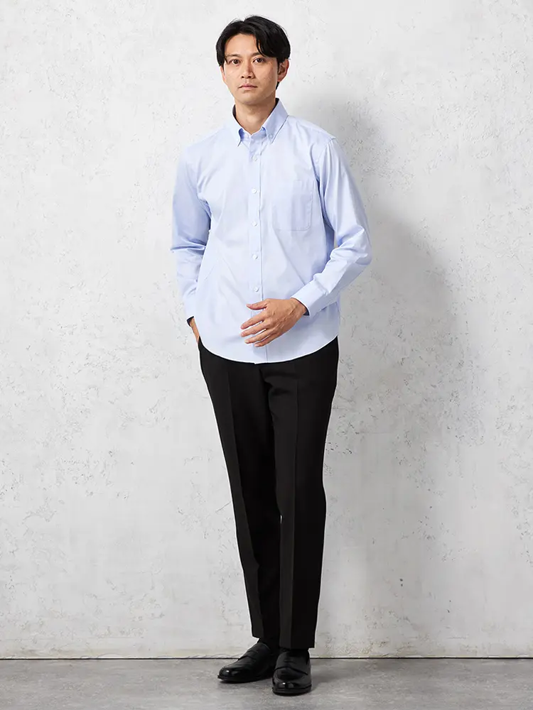 ワードローブにそろえておきたい、定番アイテムの長袖ボタンダウンシャツです。