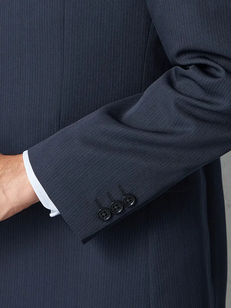 上品なストライプのベーシックな2つボタンスーツ。