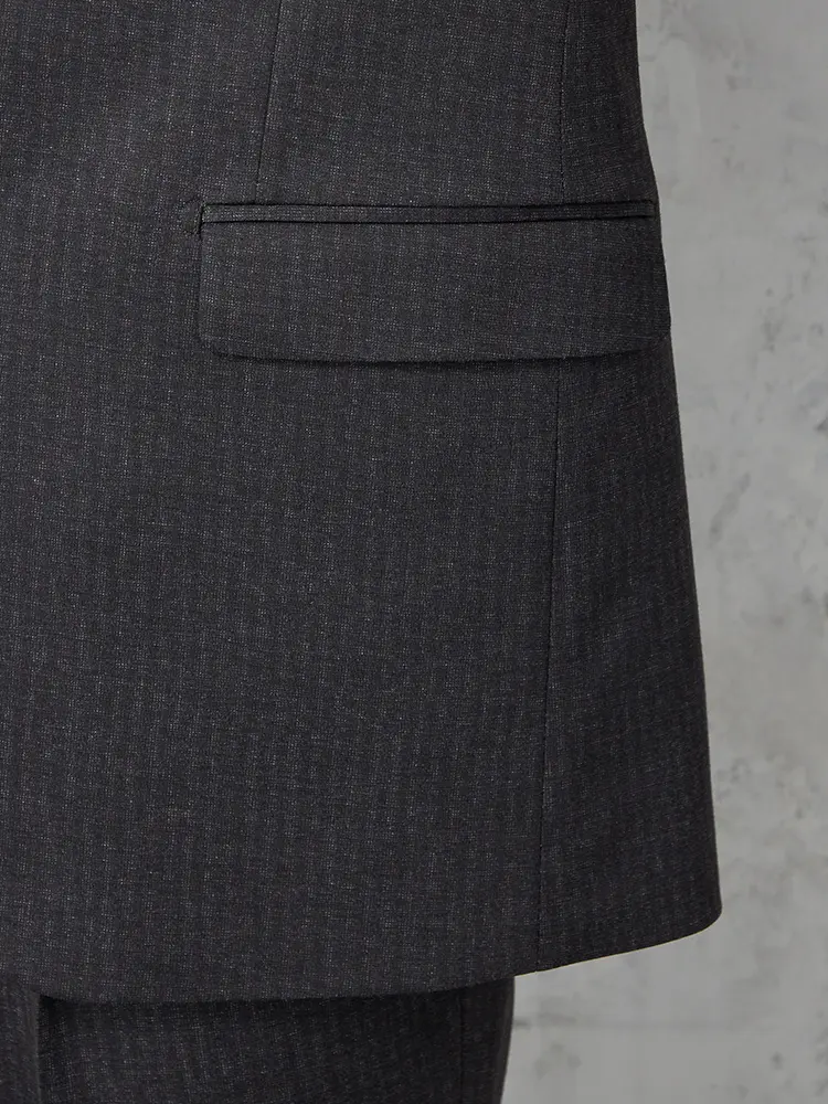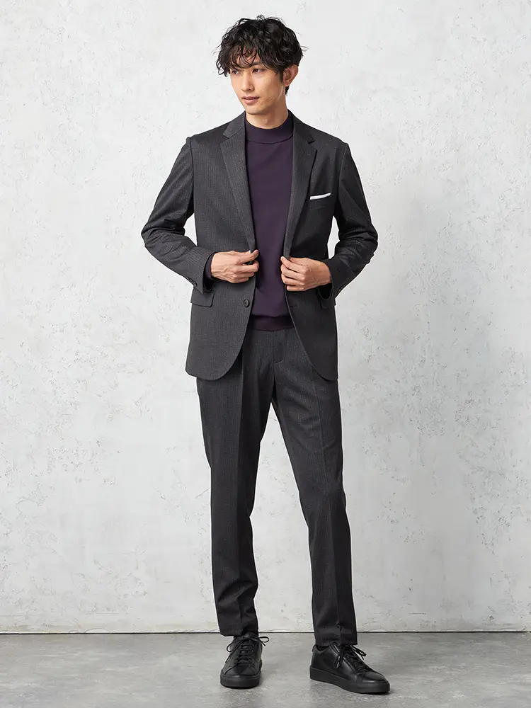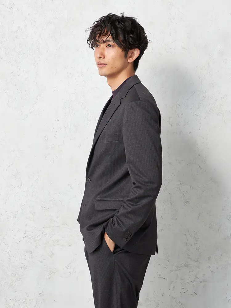 2つボタン×ノッチドラペルのスタンダードなデザインのテーラードジャケット。