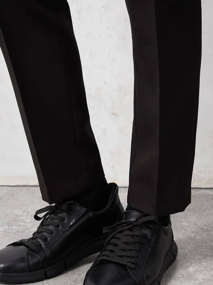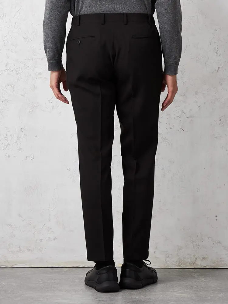 スタイリングをシャープに仕上げるノータックのスラックス。