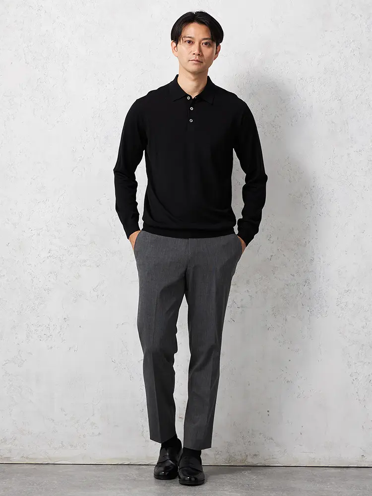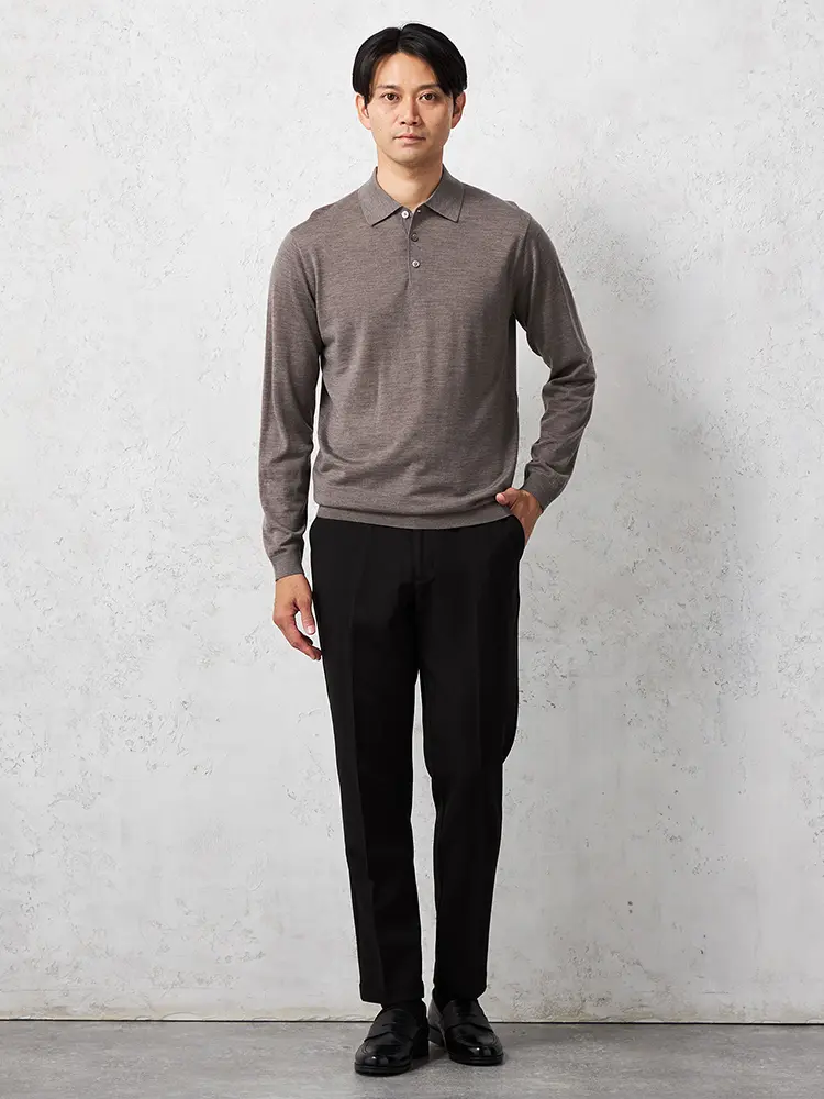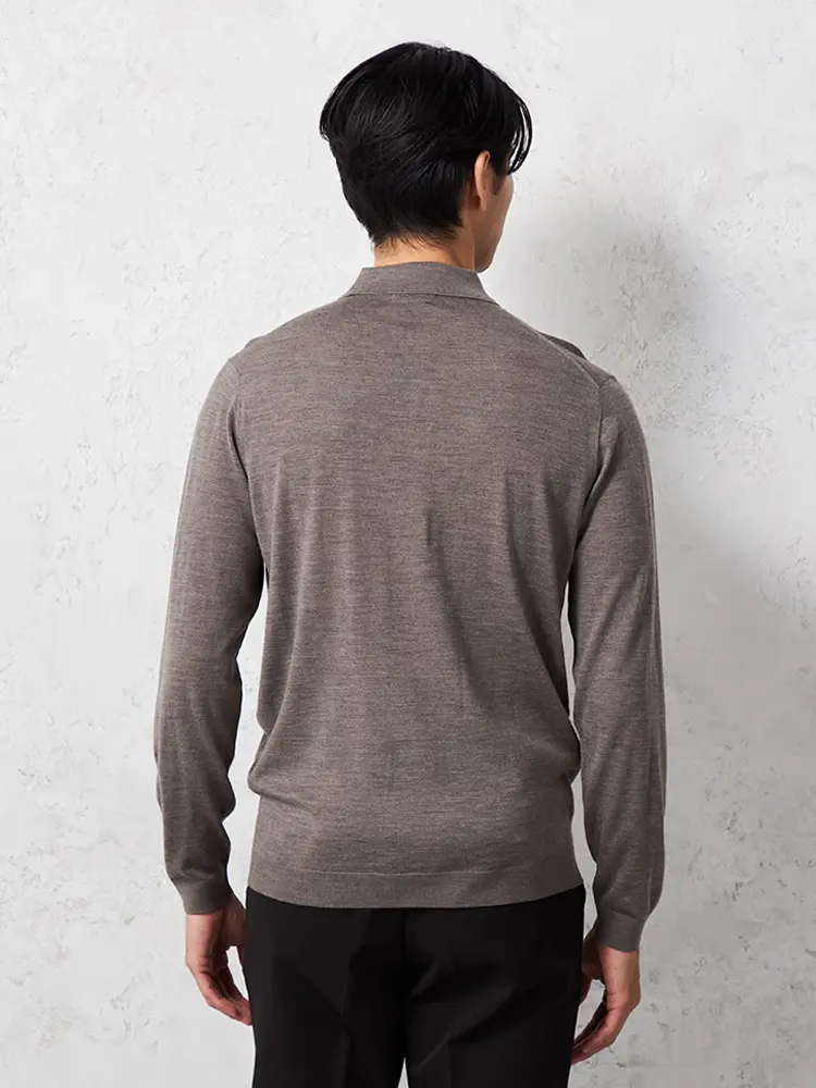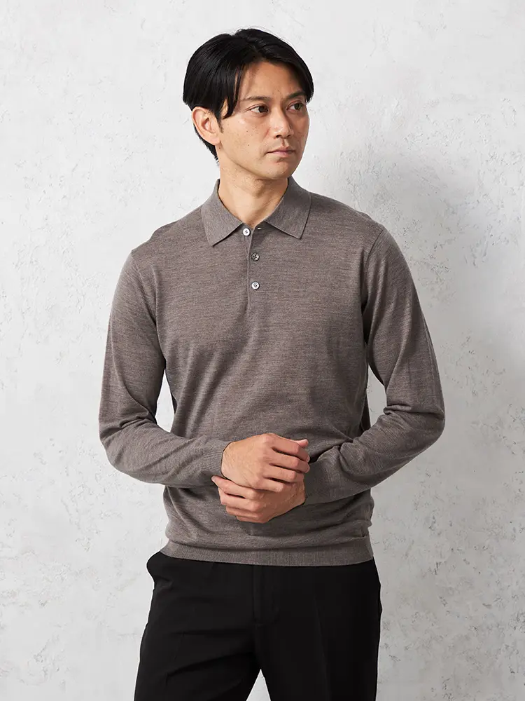 着心地の良さと、さりげない上品さ、保温性を兼ね備えた、ウルトラファインメリノウール100%梳毛の長袖ニットポロです。