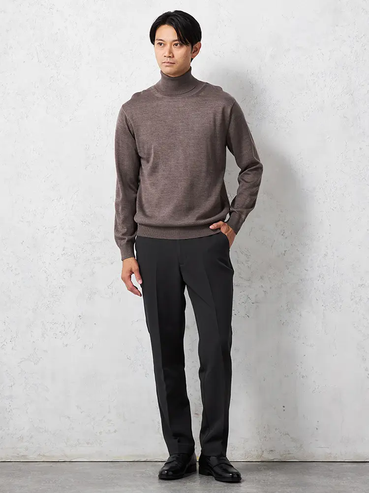 ハイゲージの編み地のなめらかな表面感は上品さを印象付け暖かみのあるコーディネートを楽しめます