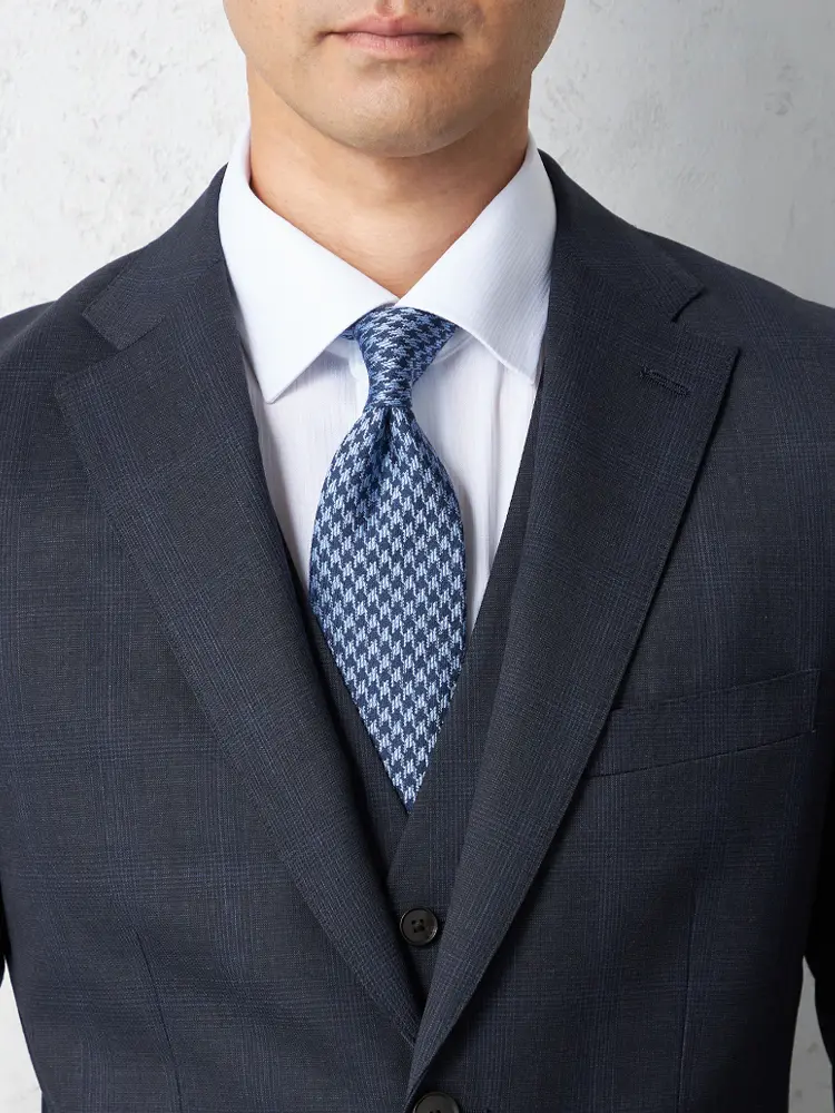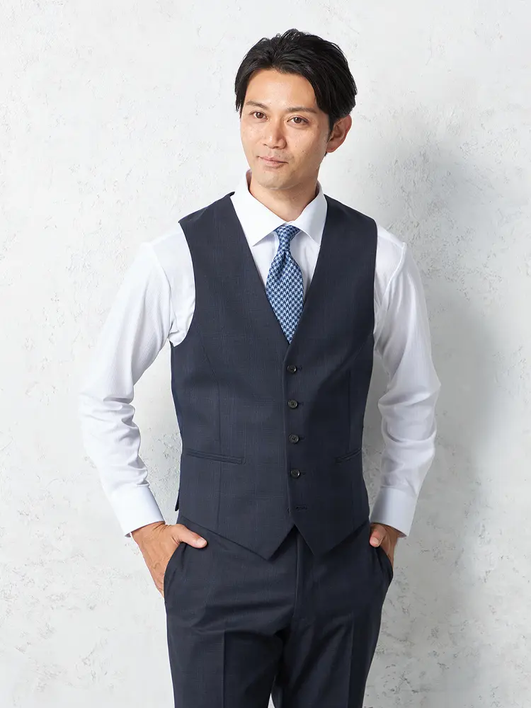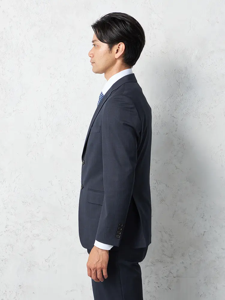 サイドベンツ背抜き仕立て仕様のチェック柄スリーピーススーツ。