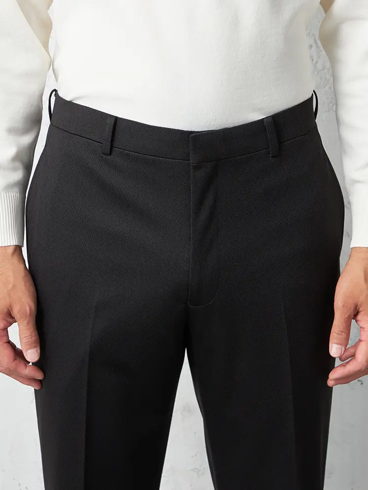 ヘリンボーン柄でクラシカル感が加わったニット素材のウォッシャブル仕様のパンツ。