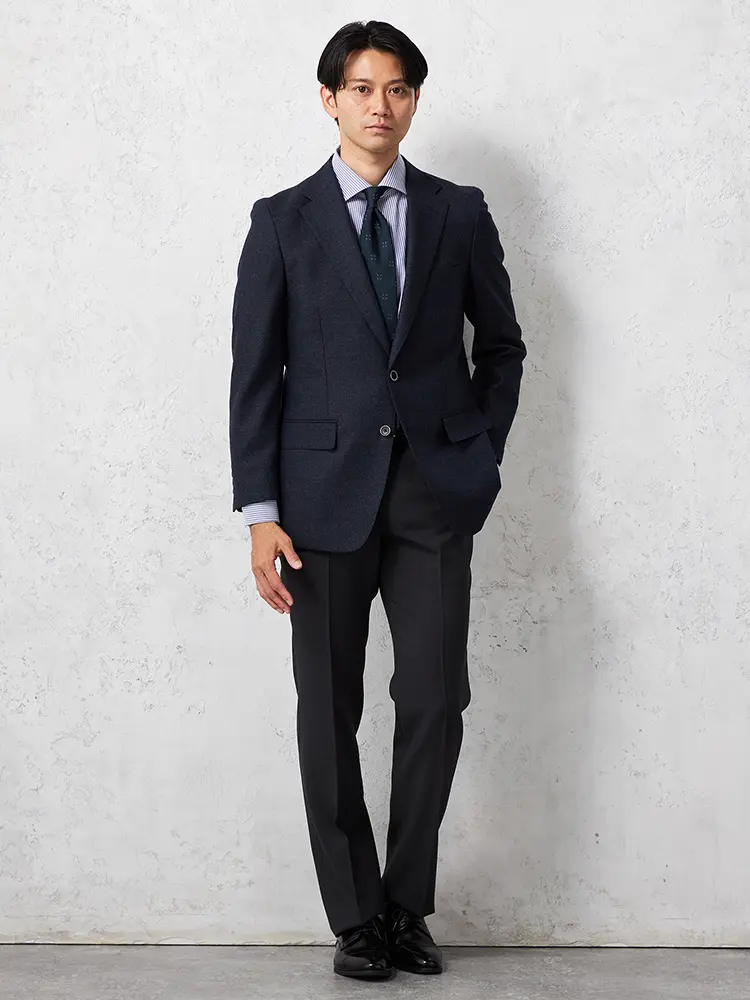 あわせるシャツやネクタイを選ばない、同素材のジャケットとのセットアップがおすすめです。