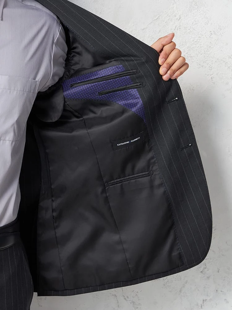 【KATHARINEEHAMNETT-キャサリン・イー・ハムネット-】スーツ2つボタン上下ウォッシャブルサスティナブルウールブラックストライプ秋冬