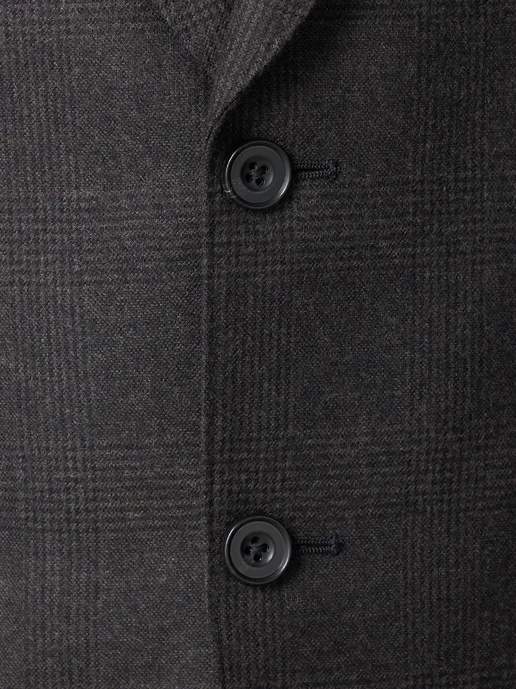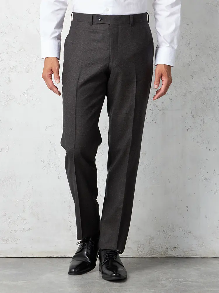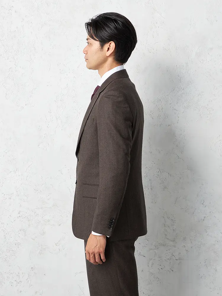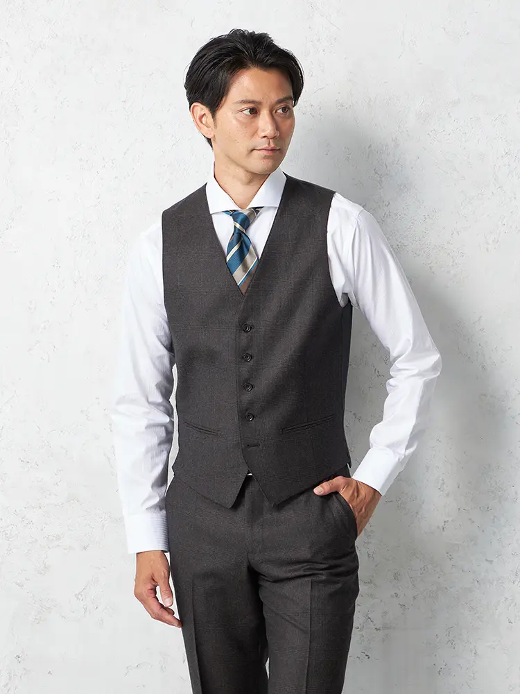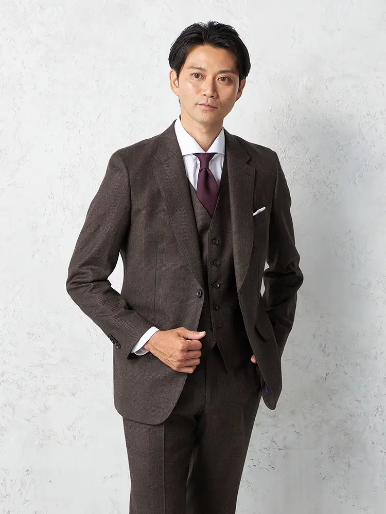 グレンチェック柄のセンターベントのノータックスリーピーススーツ。