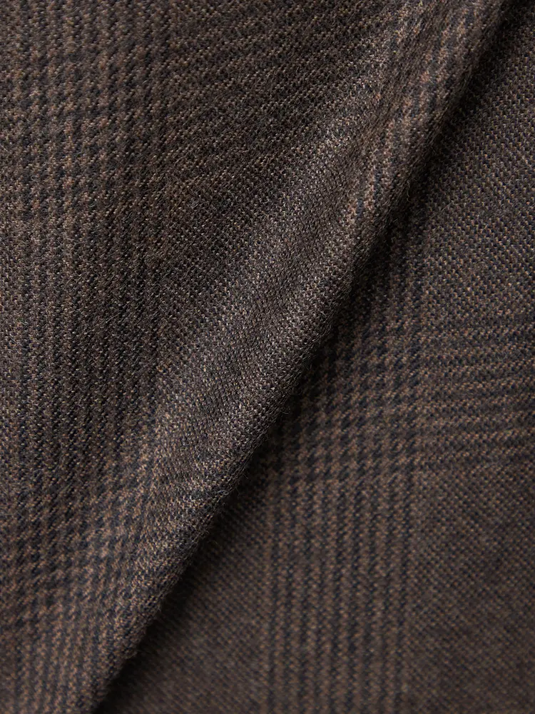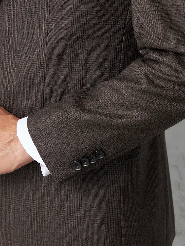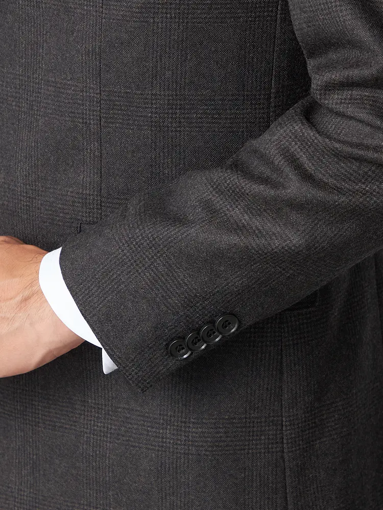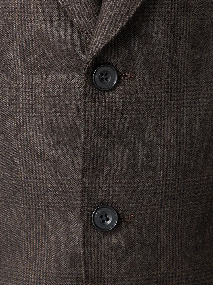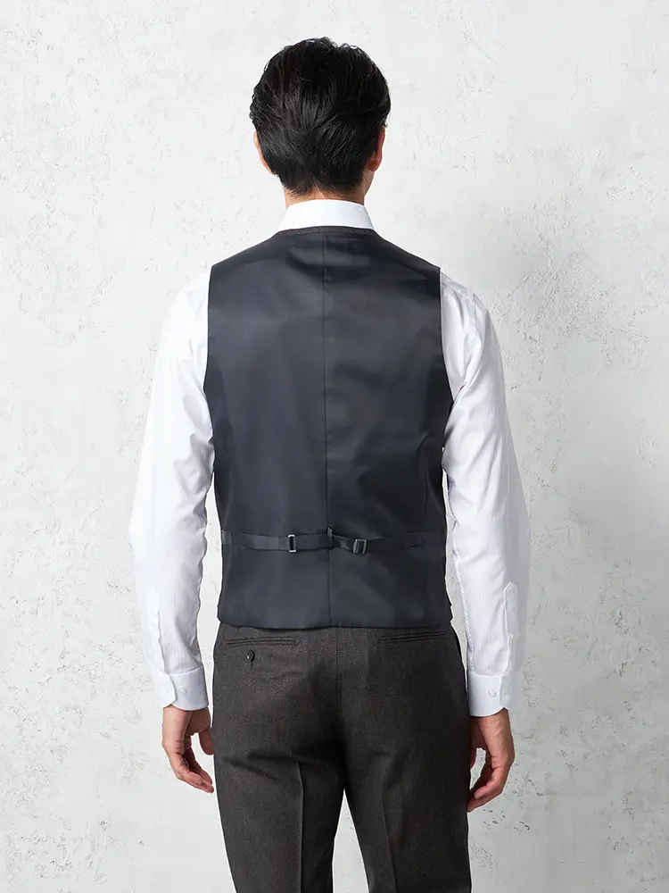 グレンチェック柄のセンターベントのノータックスリーピーススーツ。