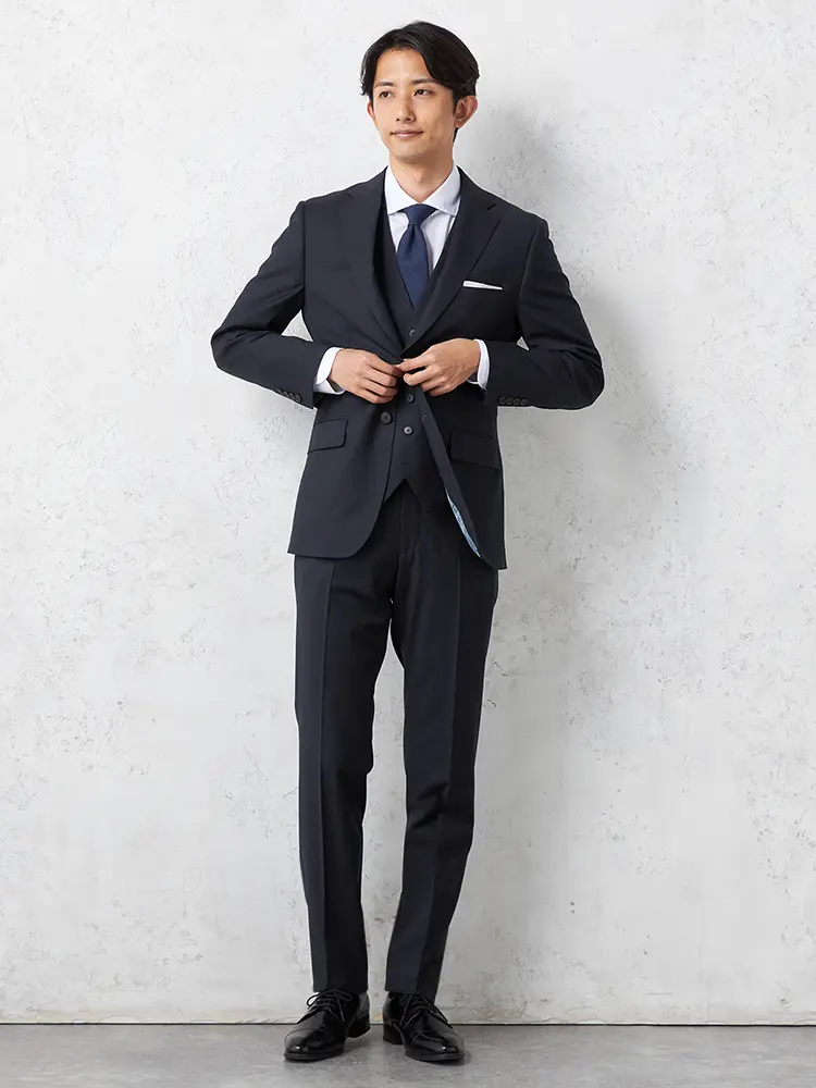 高品質ウール混素材を使用した、フレッシャーズ向けスリーピーススーツ。