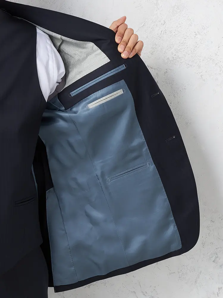 上品なネイビーがビジネスから式典まで清潔感を演出します。